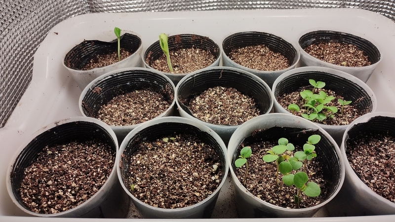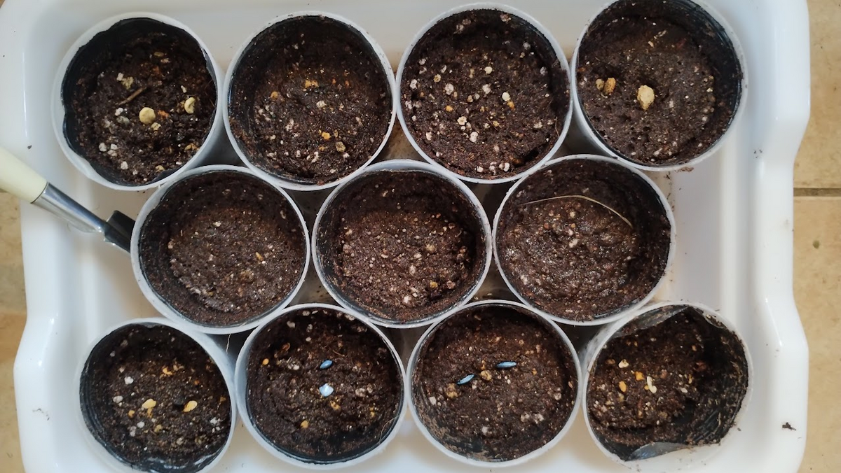 左上隅がキュウリです。キュウリのタネは横にしなければならないのですが、この時は縦に植えてしまっています。